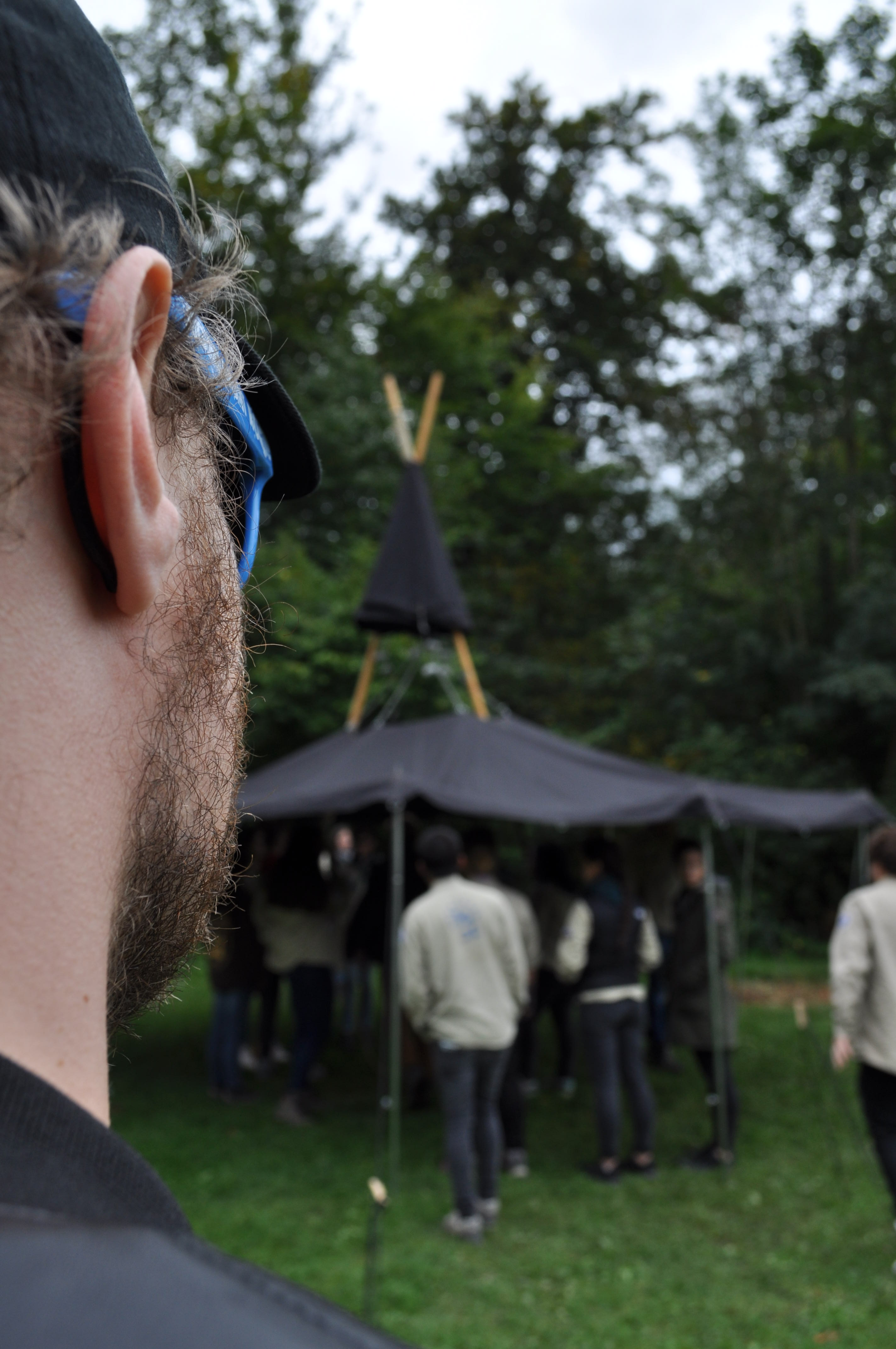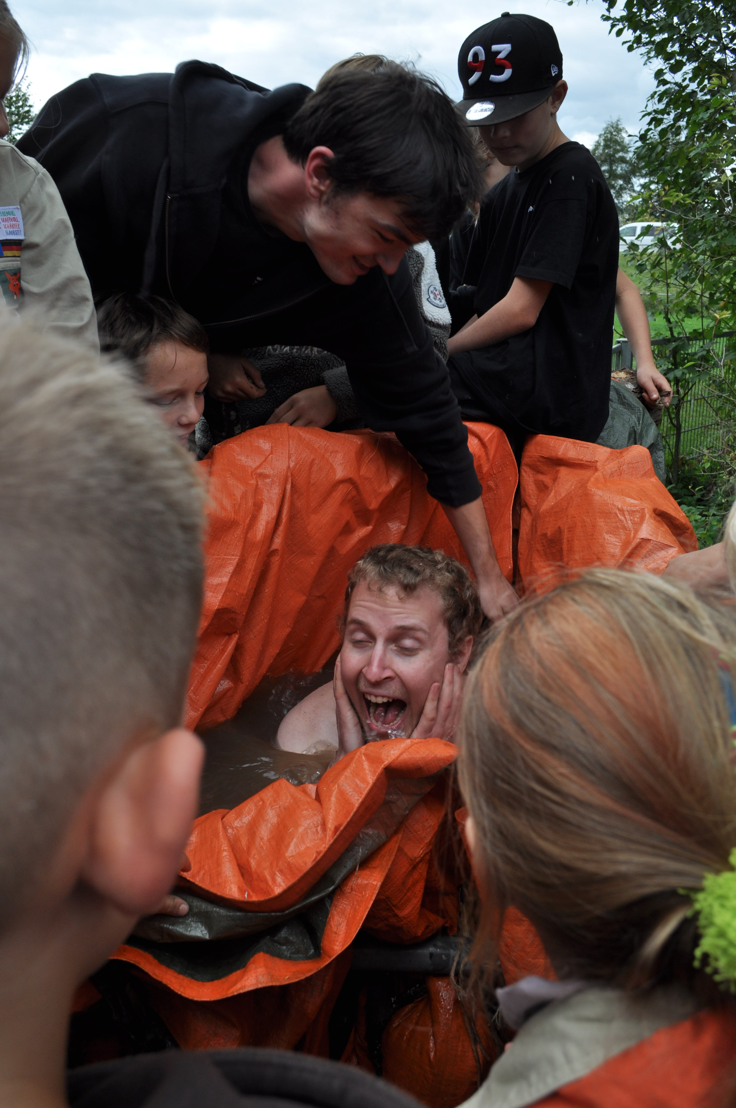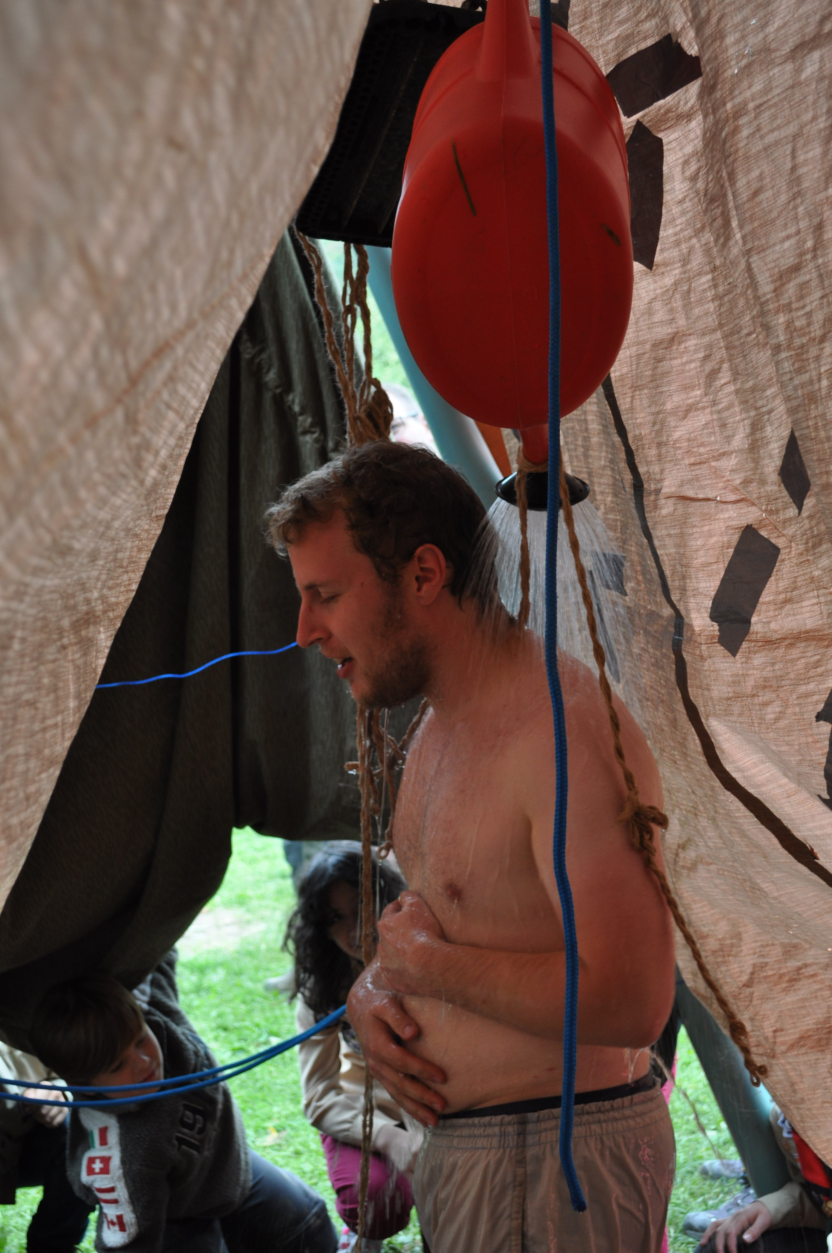 Die Aufgaben waren dabei alle so gestrickt, dass der gesamte Bezirk etwas für seinen Vorstand tut: Die zahlenmäßig größte Stufe – die 7- bis 9-jährigen Wölflinge – hatten dabei direkt zwei Aufgaben zu bewältigen: Sie mussten zum einen eine Trage bauen, mit der sie Armin dann nachher zur Kontrolle tragen sollten: Denn was ist, wenn sich Armin einmal verletzt? Dann möchte er sich ja auch versorgt wissen! Die zweite Aufgabe für die Wölflinge bestand darin, eine Warmwasserdusche mit Sichtschutz zu bauen. Für die Jungpfadfinder galt es, einen Pool für Armin zu bauen, damit er auch ausgiebig baden kann, wenn er möchte. Kriterium war lediglich, dass der Pool wenigstens einen Meter tief mit Wasser gefüllt sein musste. Die Pfadfinder und Rover mussten gemeinsam zwei Aufgaben meistern: Eine komplette Jurte (das ist ein modulares Schwarzzelt, in dem man sogar ein Feuer machen kann) in unter 12 Minuten aufbauen, damit der Armin auch jederzeit ein Dach über dem Kopf hat und außerdem ein leckeres Essen für alle zu kochen, denn Armin und seine Gäste wollen ja auch kulinarisch gut versorgt sein! Für all die Aufgaben waren nur knapp drei Stunden Zeit. Top-motiviert machten sich die Stufen an die Erfüllung ihrer Aufgaben. Die Jungpfadfinder (10-12 Jahre) überlegten, wie sie mit dem wenigen Wasser, das im Bärenbach stand, einen Pool bauen könnten, während die Wölflinge sich aufteilten: Feuerholz sammeln, um Wasser über dem Feuer zu erwärmen, die Dusche planen und aufbauen wurde gleichzeitig angegangen – bei so vielen Wölflingen war das gar kein Problem! Die Pfadfinder (13-15 Jahre) und die Rover (16-21 Jahre) übten gemeinsam den Aufbau der Jurte, damit es nachher bei der Präsentation der Ergebnisse nicht peinlich wird. Armin schlenderte derweil über den Platz und überprüfte kritisch die Entwicklungen – er war sich ja eh sicher, dass die Kinder und Jugendlichen das alles nicht schaffen. So siegessicher stolzierte er von einer Baustelle zur nächsten und verteilte frische Gurken und Äpfel vom Wochenmarkt zur Stärkung.