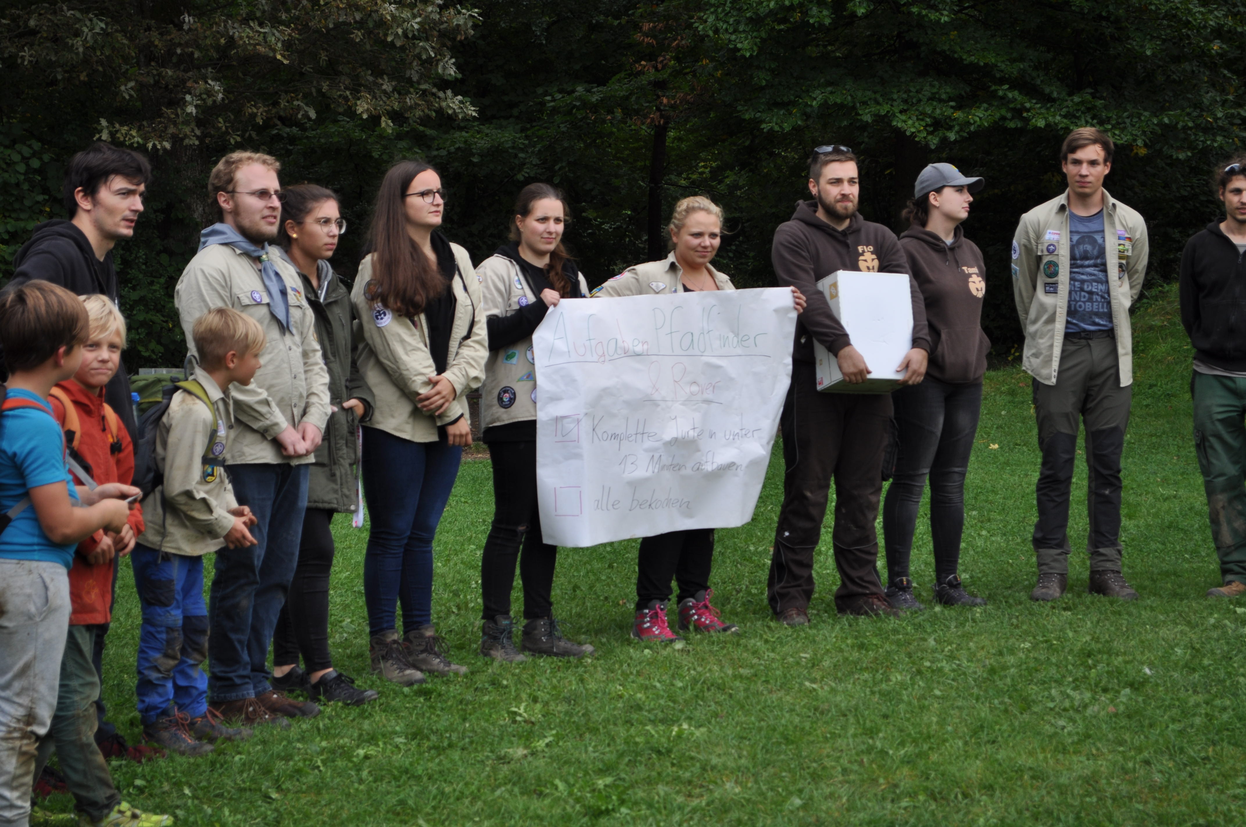 Nachdem die Zeit vorüber war, tauchte Armin dann bei 12°C in Badehose auf: Offensichtlich waren die Aufgaben zumindest soweit erfüllt, dass die Stufen etwas zu präsentieren hatten. Den Anfang machten die Rover und die Pfadfinder: Armin stoppte die Zeit und hielt den Timer dann bereits nach sechseinhalb Minuten an. Doch nach genauer Inspektion stellte Armin fest: „Pfusch am Bau! Sauerei!“, denn viele Verbindungsösen zwischen den einzelnen Planen waren nicht zusammengeknüpft. Also lief die Zeit weiter und stoppte dann erneut bei neuneinhalb Minuten. Diesmal hielt die Jurte der Prüfung stand und es ging für Armin auf der Trage weiter zum Pool, was ebenfalls die Wölflinge problemlos hinbekommen hatten. Bewaffnet mit einem Meterstab stieg Armin in die eiskalte braune Brühe. Ein Filtersystem und eine Warmwasserzufuhr waren leider nicht im Aufgabentext enthalten. Nach einer Messung mit dem Meterstab stand dann fest: Die Jungpfadfinder hatten ihr Soll ebenfalls erfüllt, denn der Pool war genau einen Meter und einen Zentimeter tief. Was für eine Gaudi! Frierend ging es für Armin dann im Bademantel weiter zur Warmwasserdusche. Glücklicherweise stand hier im Aufgabentext, dass das Wasser auch sauber sein musste! Nach dem eiskalten Pool tat die Dusche mit warmem Wasser richtig gut und Armin duschte das gesamte Warmwasser leer – kennt mancher vielleicht von daheim? Danach ging Armin sich in seiner Jurte wieder etwas anziehen. Er brauchte etwas Zeit, um sich das alles nochmal durch den Kopf gehen zu lassen. Als er herauskam, war schon zu vermuten: Die Überzeugungsarbeit könnte funktioniert haben, denn er trug zum Glück wieder die Wanderstiefel, die Kluft und sein Halstuch. Mit dem großen Filzstift kreuzte er Plakat für Plakat die Aufgaben ab, die erfolgreich erledigt wurden und übrig blieb nur noch das Essen für alle. Direkt machten sich die Pfadfinder- und Roverstufe gemeinsam an die Erfüllung dieser letzten Aufgabe und grillten mal eben für 70 Personen rote Würstchen und Grillkäse und schnitten die Wecken auf. Am Ende war dann klar: Die Aufgaben wurden alle erfolgreich gemeistert und Armin hatte keine andere Wahl als zu akzeptieren: Die Pfadis rocken alles, wenn sie das wollen! Er bleibt also weiterhin Vorstand im wunderbaren Bezirk Hohenstaufen der DPSG – Mission aus Sicht der Arbeitsgruppe Bezirkstag erfolgreich abgeschlossen! Nach den Danksagungen an alle Helferinnen und Helfer und an alle Leiterinnen und Leiter aus den Stämmen ging es abends nach all den Anstrengungen und dem abschließenden Gut-Pfad-Gruß erschöpft, aber happy wieder nach Hause – bis zum Bezirkstag 2020!