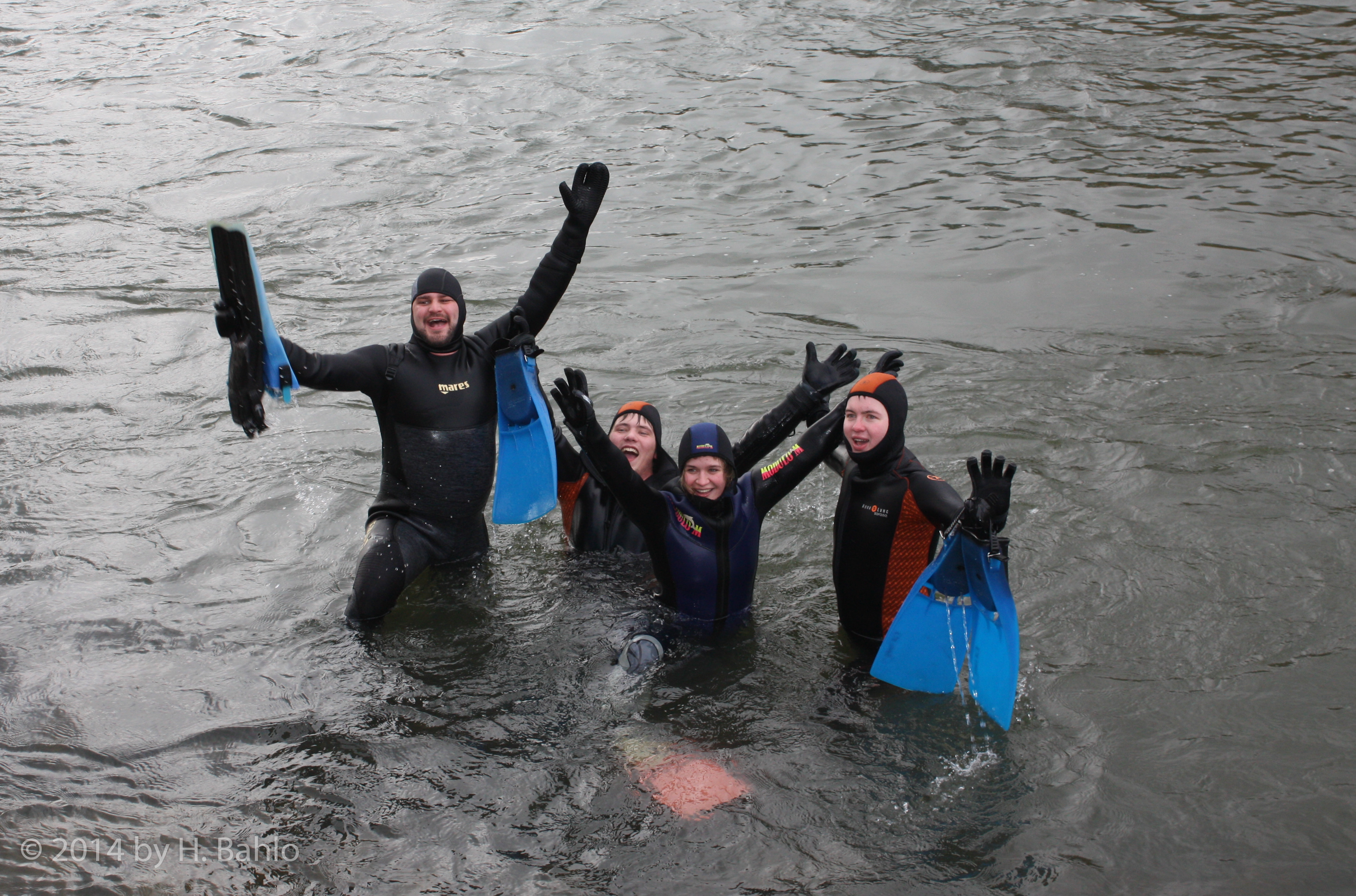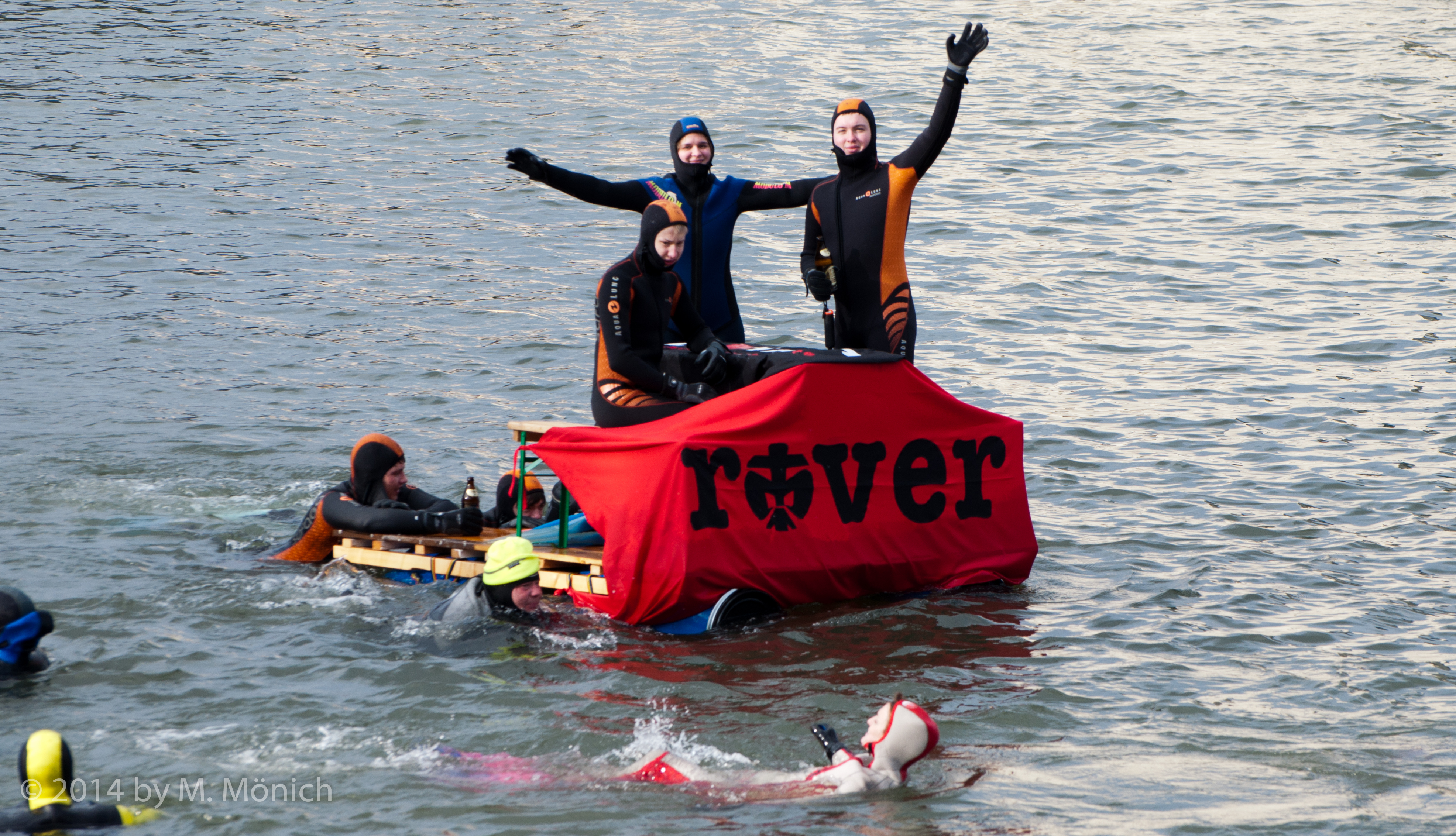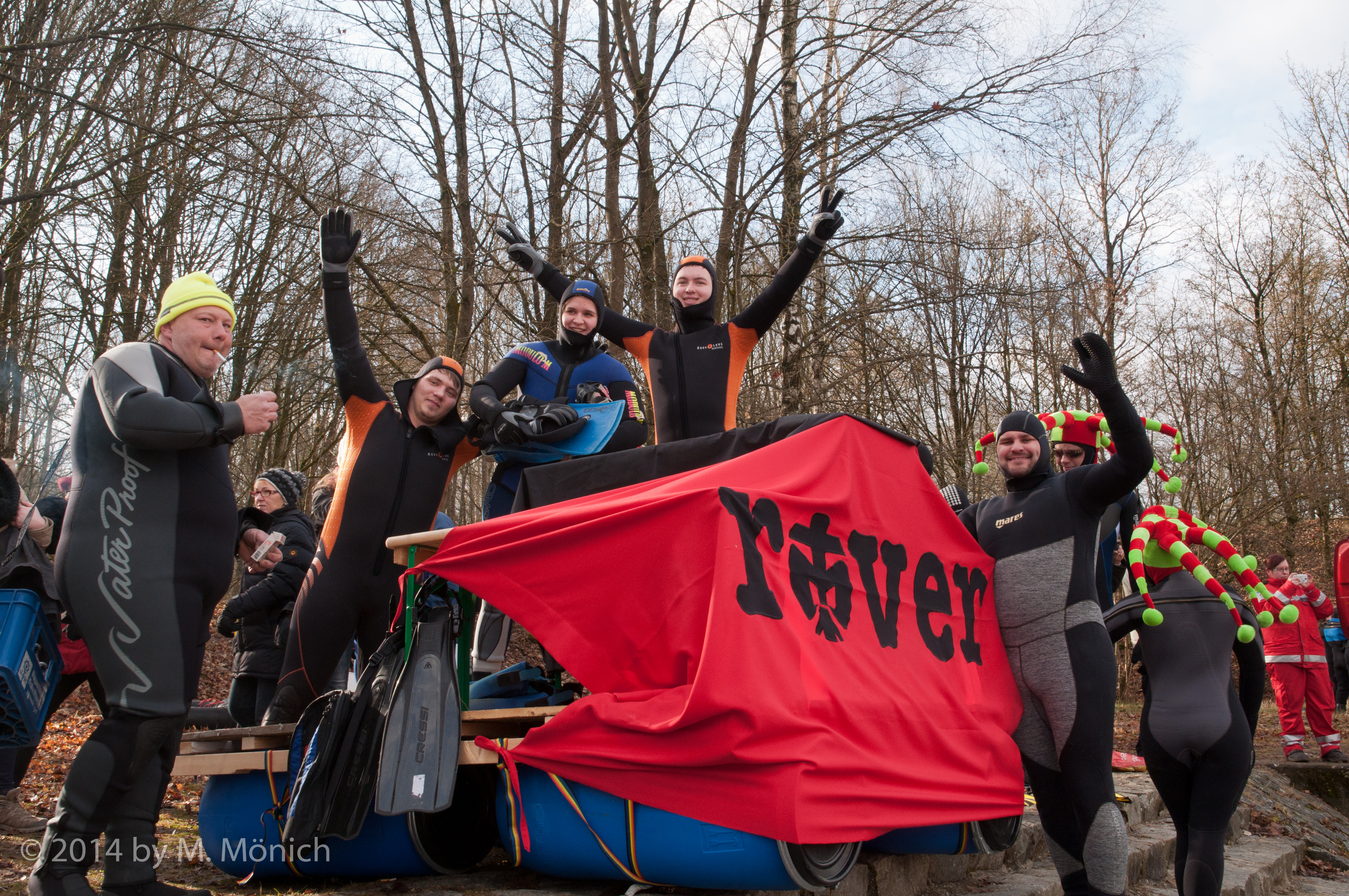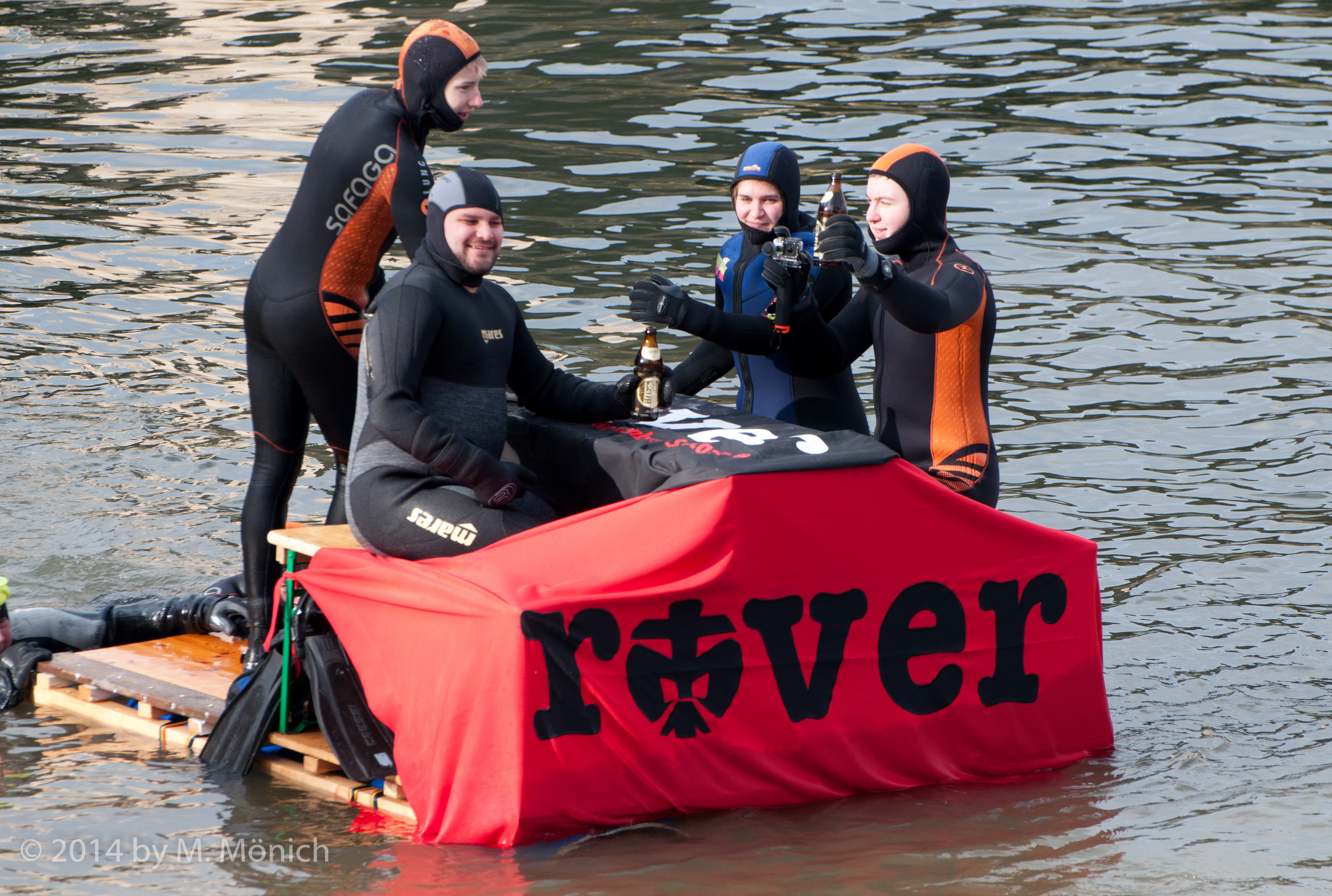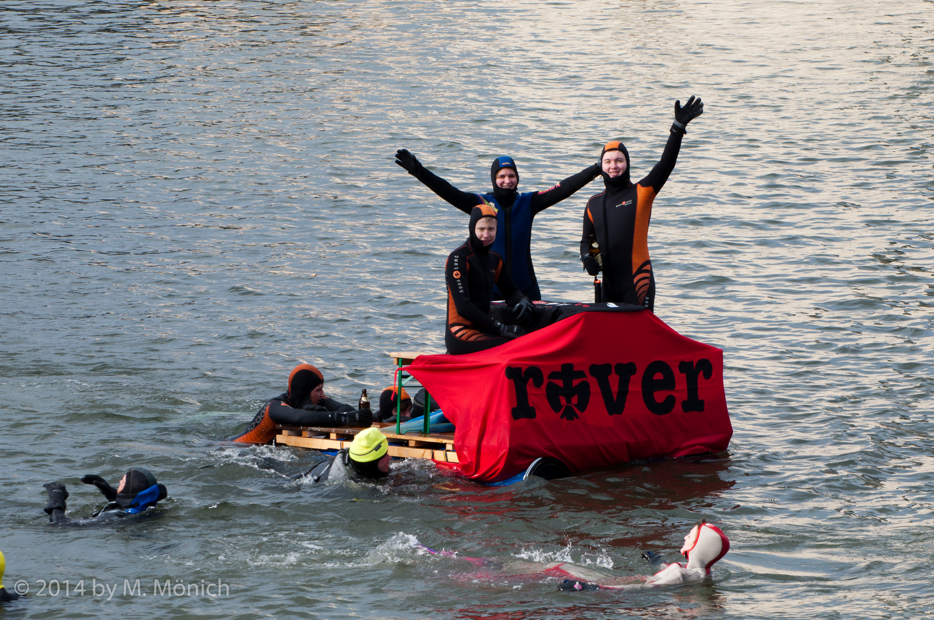Auch wir hatten unseren Spaß. Nach anfänglichen Schwierigkeiten das Floß aufrecht zu halten, hatten wir irgendwann den Dreh raus und kamen im Fahrwasser der Donau schnell voran. Dennoch drohte unser Floß zweimal zu kentern, was nur durch beherztes Eingreifen zweier Leiter abgefangen werden konnte. Je näher wir dem Ziel kamen, desto mehr Leute zäumten das Ufer und die Jubelschreie und der Applaus nahmen zu. Im Ziel angekommen wurden Gruppenbilder geschossen, was in den letzten Jahren undenkbar gewesen wäre, da sowohl die Luft- als auch Wassertemperaturen wesentlich niedriger waren. Das DRK verteilte warme Suppe in Plasikbechern an die vielen Schwimmer, die aus dem Wasser stiegen. Nach einem kurzen Fußweg erreichten wir das Hallenbad, nicht aber bevor uns die Feuerwehr den gröbsten Dreck von unseren Anzügen abspritzte. Froh, sich im warmen Wasser aufwärmen zu können, ging die Party im Hallenbad weiter. Nach dem Duschen und Umziehen ging es nun wieder zurück zur Pingu-Wasserwacht-Arena, in der die Medaillenausgabe und Pokalübergabe stattfand. Den Preis für das ausgefallenste Boot bekam die Gruppe „D’Hauser“ – Männer und Frauen aus Ober- und Unterhausen, die ein Wikingerschiff gebaut und sich alle als Wikinger verkleidet hatten.